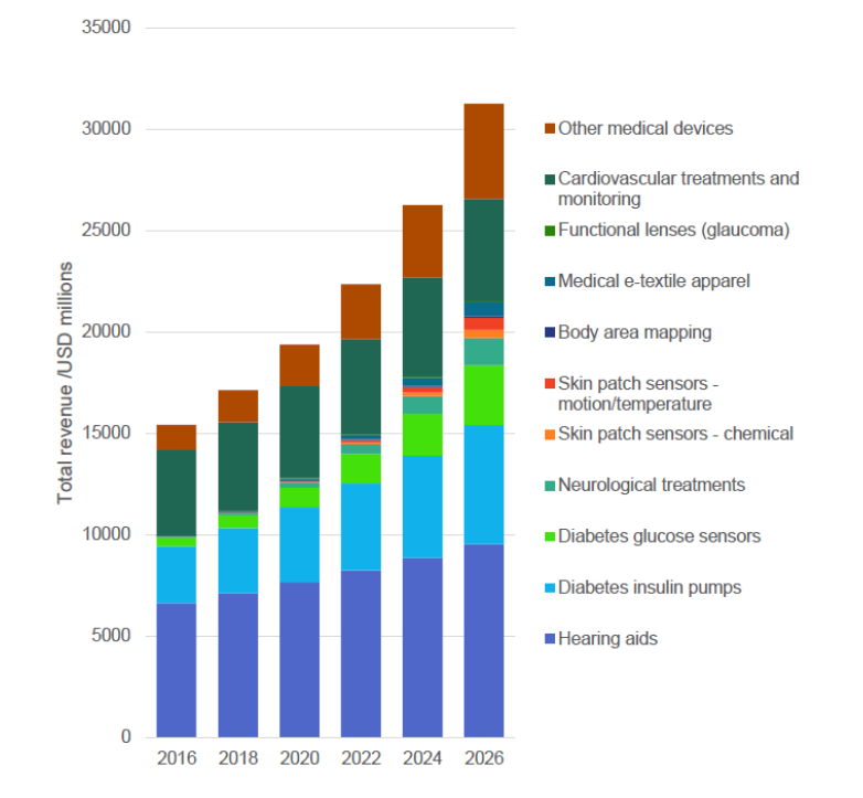 Medical-grade sensor market is growing with a large focus on key impairments such as diabetes. The big players in this space such as Roche, Dexcom, and Abbott are increasingly commercialising wearable continous glucose monitoring and insulin pump systems with some impressive results.